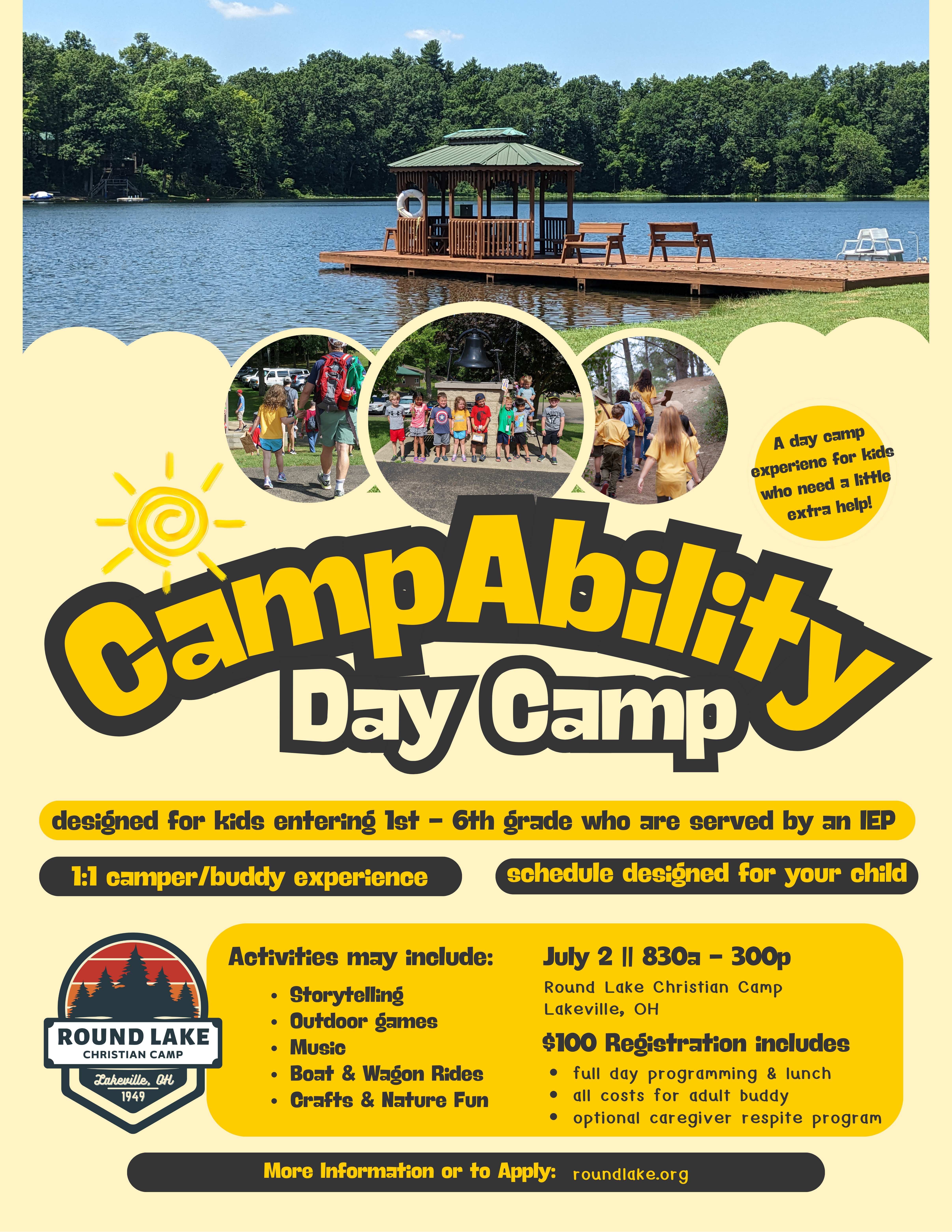 Campers will experience many of the same activities they would enjoy at a traditional camp session – worship, Bible experiences, boat rides, crafts, games, and lots of fun – all geared to serve each child’s specific needs. Each camper will have their own buddy and a personal schedule designed just for them. Please note that due to the nature of this session, there will be no swimming at CampAbility.